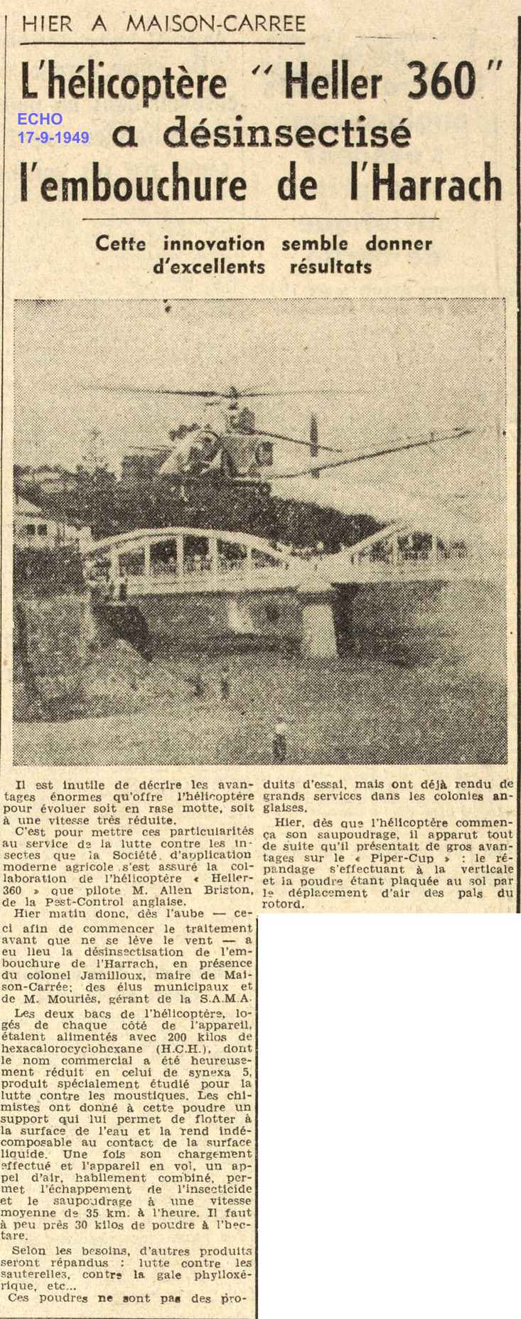 très réduite. C'est pour mettre ces particularités au service de la lutte contre les Insectes que la Société d'application moderne agricole s'est assuré la collaboration de l'hélicoptère Heller- 360 que pilote M. Allen Briston de la Pest-Control anglaise. Hier matin donc, dès l'aube ceci afin de commencer le traitement avant que ne se lève le vent a eu lieu la désinsectisation de l'embouchure de l'Harrach, en présence du colonel Jamilloux, maire de Maison-Carrée; des élus municipaux et de M. Mouriès, gérant de la S.A.M.A Les deux bacs de l'hélicoptère, logés de chaque côté de l'appareil, étaient alimentés avec 200 kilos de hexacalorocyclohexane (H.C.H.), dont le nom commercial a été heureusement réduit en celui de synexa 5, produit spécialement étudié pour la lutte contre les moustiques. Les chimistes ont donné à cette poudre un support qui lui permet de flotter à la surface de l'eau et la rend indécomposable au contact de la surface liquide. Une fois son chargement effectué et l'appareil en vol, un appel d'air, habilement combiné, permet l'échappement de l'insecticide et le saupoudrage à une vitesse moyenne de 35 km. à l'heure. Il faut à peu près 30 kilos de poudre à l'hectare. Selon les besoins, d'autres produits seront répandus : lutte contre les sauterelles, contre la gale phylloxérique, etc... Ces poudres ne sont pas des produits d'essai, mais ont déjà rendu de grands services dans les colonies anglaises. Hier. dès que l'hélicoptère commença son saupoudrage, il apparut tout de suite qu'il présentait de gros avantages sur le "Piper-Cup" : le répendage s'effectuant à la verticale et la poudre étant plaquée au sol par le déplacement d'air des pales du rotor. |