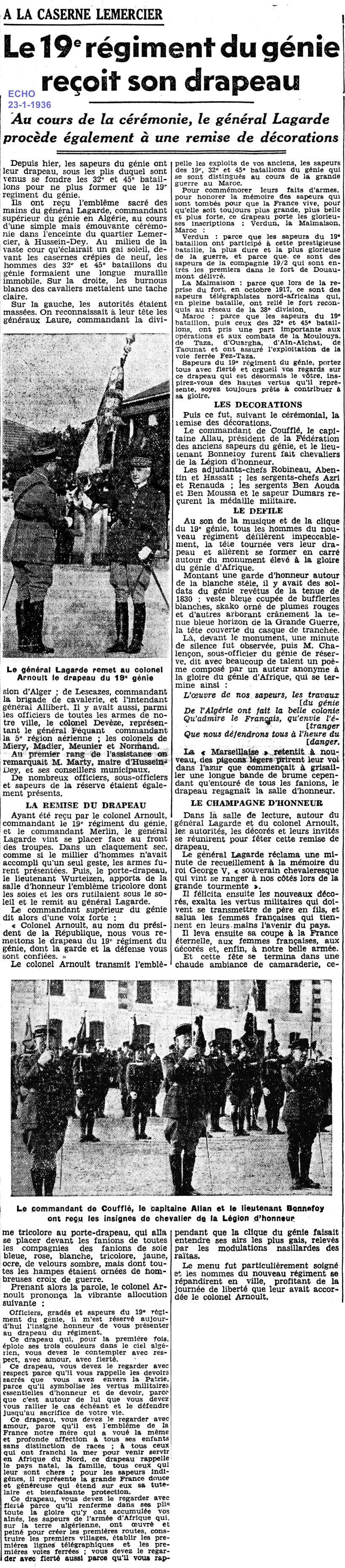 du génie. Ils ont reçu l'emblême sacré des mains du général Lagarde, commandant supérieur du génie en Algérie, au cours d'une simple mais émouvante cérémonie dans l'enceinte du quartier Lemercier, à Hussein-Dey. Au milieu de la vaste cour qu'éclairait un gai soleil, devant les casernes crépies de neuf, les hommes des 32° et 45° bataillons du génie formaient une longue muraille immobile. Sur la droite, les burnous blancs des cavaliers mettaient une tache claire. Sur la gauche, les autorités étaient massées. On reconnaissait à leur tête les généraux Laure, commandant la diviIsion d'Alger ; de Lescazes, commandant la brigade de cavalerie, et l'intendant général Allibert. Il y avait aussi, parmi , les officiers de toutes les armes de notre ville, le colonel Devèze, représentant le général Féquant commandant la 5° région aérienne ; les colonels de Miery, Madier, Meunier et Normand. Au premier rang de l'assistance on remarquait M. Marty, maire d'Husseind Dey, et ses conseillers municipaux. De nombreux officiers, sous-officiers let sapeurs de la réserve étaient également présents. (suite dans l'article.) |